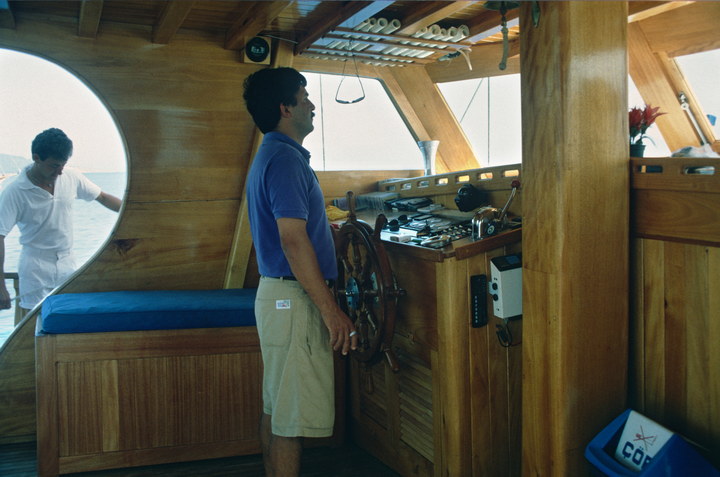 1989. Türkei. Reise auf einem Segelboot. Mittelmeer. Der Skipper / Rudergänger am Ruder. Brücke.