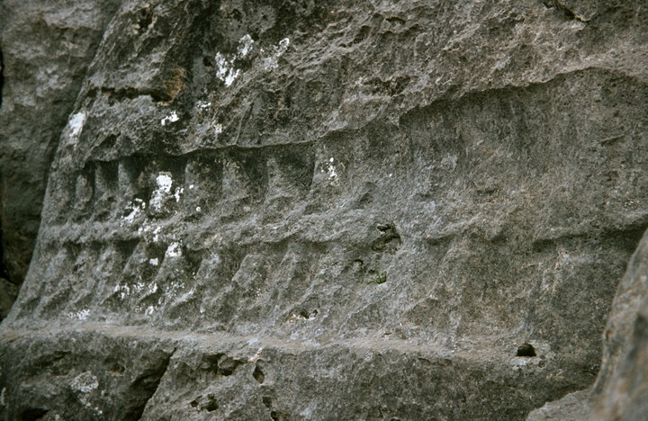 - (A) Ostwand; König Tuthalija IV. über den Bergen schreitend, vor ihm seine Namenskartusche, in seiner Linken der Lituus, die Figur in der Kartusche stellt einen Berggott dar. (Höhe der Königsfigur ohne Berge 220 cm) 1250-20 vor Christus. Der König Tuthalija IV war der Stifter des Heiligtums.