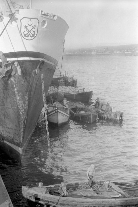 1954. Türkei. Marmara. Istanbul. Turkey. Türkiye. Marmarameer. Boote an einem Schiff im Hafen