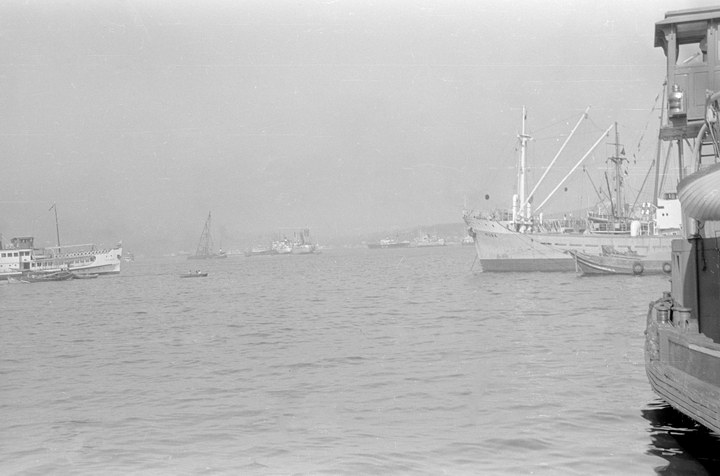 1954. Türkei. Marmara. Istanbul. Turkey. Türkiye. Marmarameer. Boote und das Schiff Güneysu
