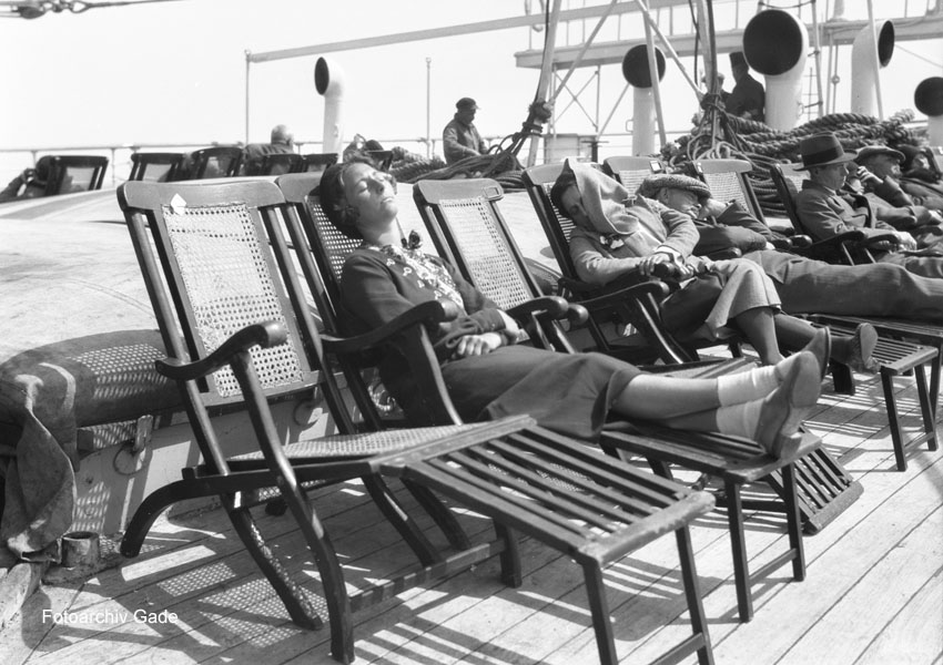 1932. Afrikareise. Schiff auf dem Mittelmeer. Frau auf einem Liegestuhl. Sonnen