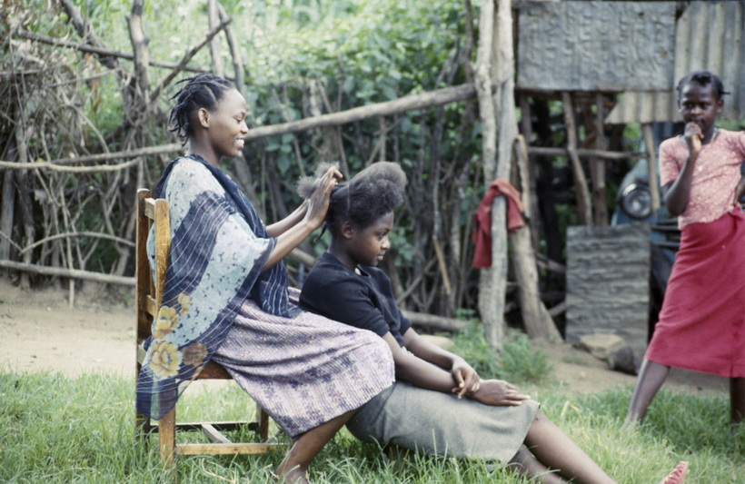1986. Afrika, Ostafrika, Republik Kenia, Republic of Kenya, Jamhuri ya Kenya (Kisuaheli). Frauen bei der Haarpflege. Frisieren, Friseur
