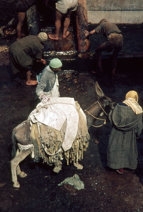 um 1967. Afrika. Marokko. Gerberei und Färberei in Fès. Leder. Stoffe. Teppiche. Esel.