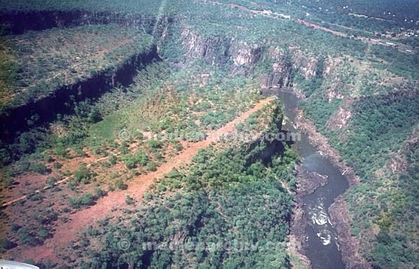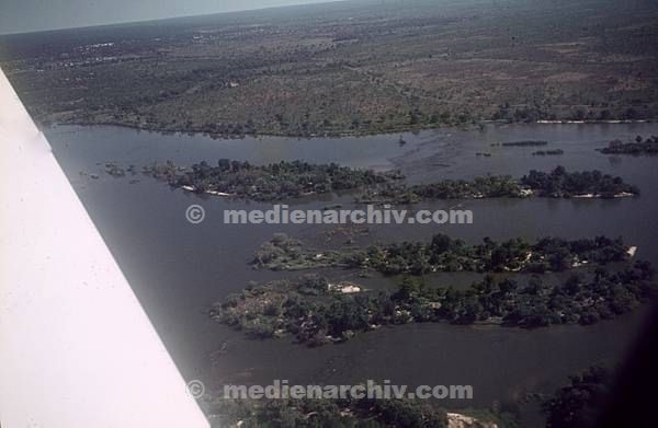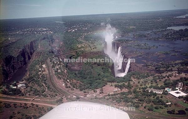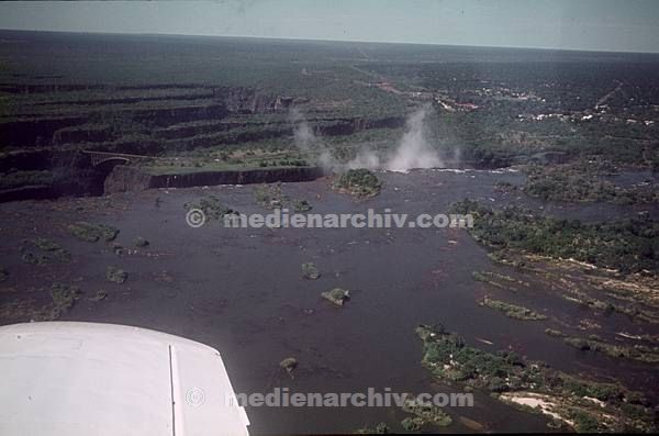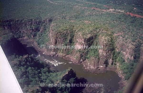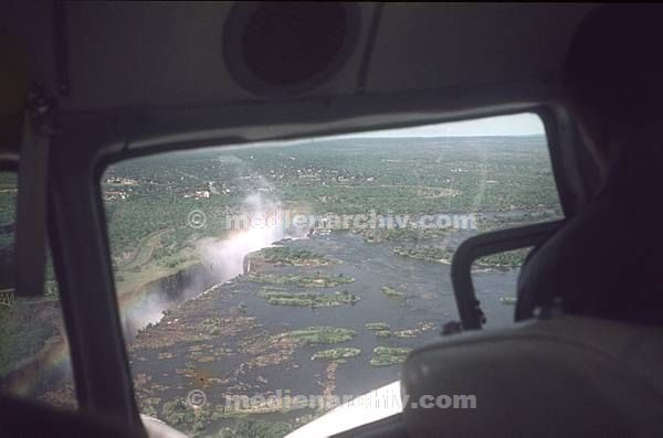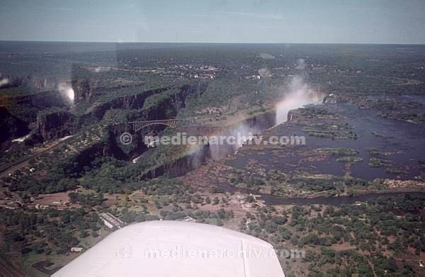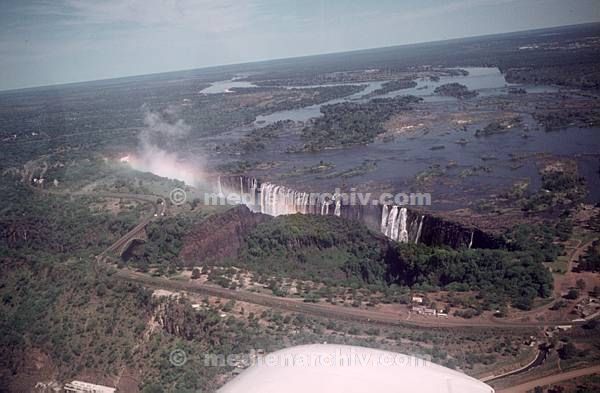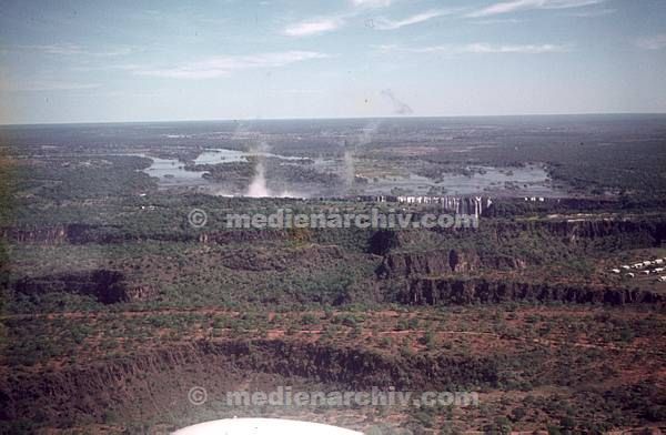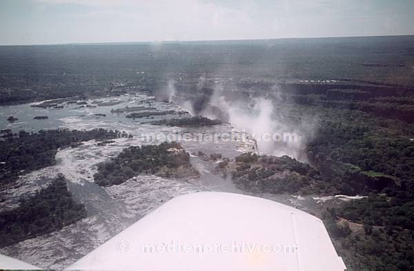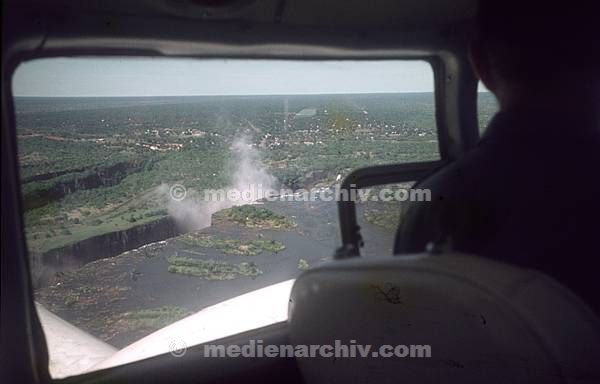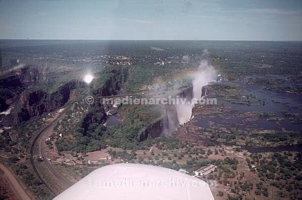 um 1975. Afrika. Simbabwe. Zimbabwe. Bis 1980 südliches Rhodesien. Victoriafälle. Wasserfall an der Grenze zwischen Simbabwe und Sambia. Im Flugzeug