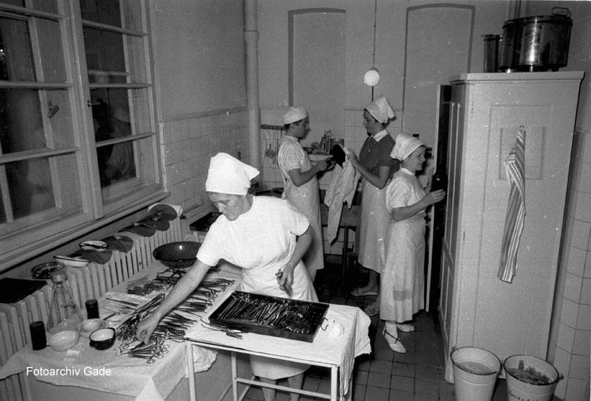 1958. Gesundheit / Medizin. DDR. Berlin. Pankow. Ortsteil: Buch. Krankenhaus Buch. Instrumentenraum. Säubern des OP.