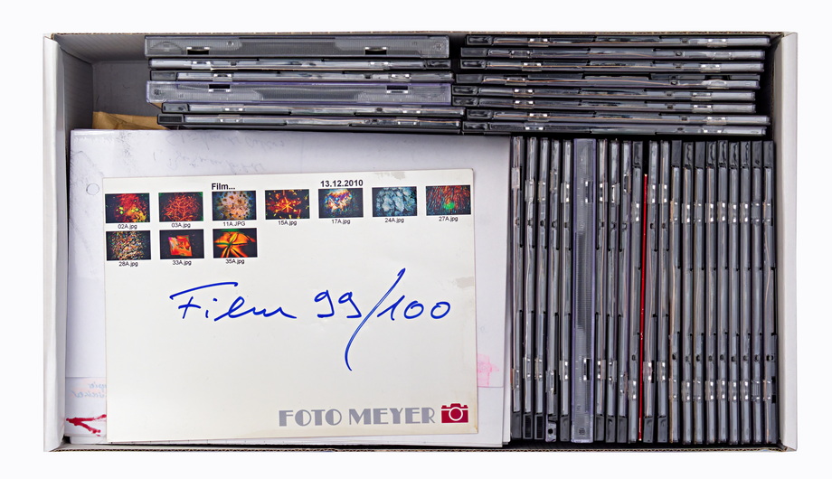 It comprised around 100 rolls of 35mm film with up to 36 exposures each. They were stored together with numerous prints (mostly in 13 × 18 cm format) in film-processing envelopes. One roll contains reproductions of images that had already been photographed. The other 99 rolls, however, each show new motifs under the microscope. Baake kept detailed notes, making it possible to trace exactly what was photographed. Most films were fully exposed, resulting in 36 images each. In rare cases, there were also photographs from the domestic environment, such as his kitchen or a bookshelf. The reason for these images is unclear; perhaps they were intended as a basis for white balance in the microphotographs. Due to exposure bracketing, each roll contained only about 5–10 different motifs, amounting to roughly 750 distinct subjects in total. The processing envelopes were stored in a cardboard box about the size of a banana crate and weighed over 18 kilograms altogether.
