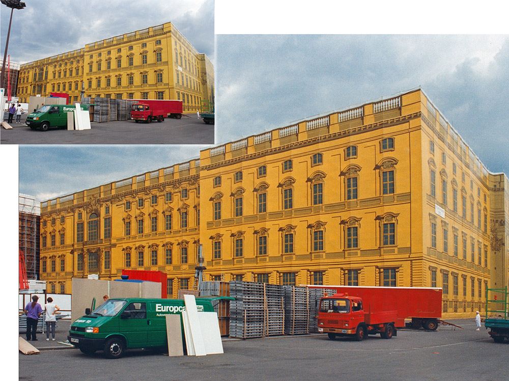 1993 / 1994 - Stadtschloss Simulation in Berlin. Der 10x15 Abzug (links oben) wird mit 800 oder 1200 DPI gescannt. Mithilfe digitaler Bildbearbeitung werden die stürzenden Linien entzerrt. Die Bildqualität ist - gemessen an der Vorlage - besser als erwartet, aber nicht auf dem Niveau, das durch Scannen des Negativs erreichbar wäre.