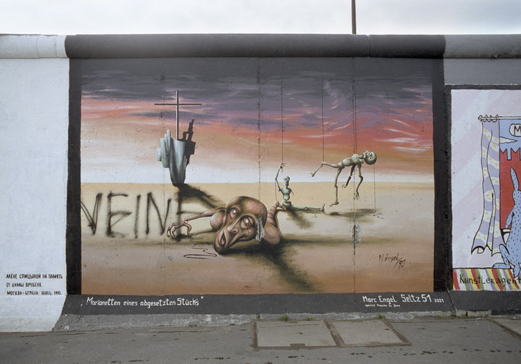 Oktober 1995. Berlin. Friedrichshain. East-Side-Gallery. Gemälde von Marc Engel. 'Marionetten eines abgesetzten Stücks.'
