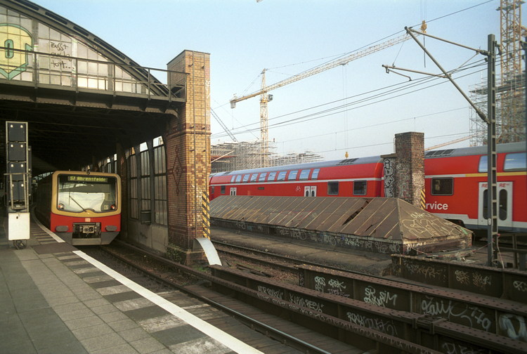 März 2002. Berlin. Mitte. Moabit. Verkehr. Bahn. Schiene. Lehrter Stadtbahnhof. S-Bahn und Eisenbahn. Zug.