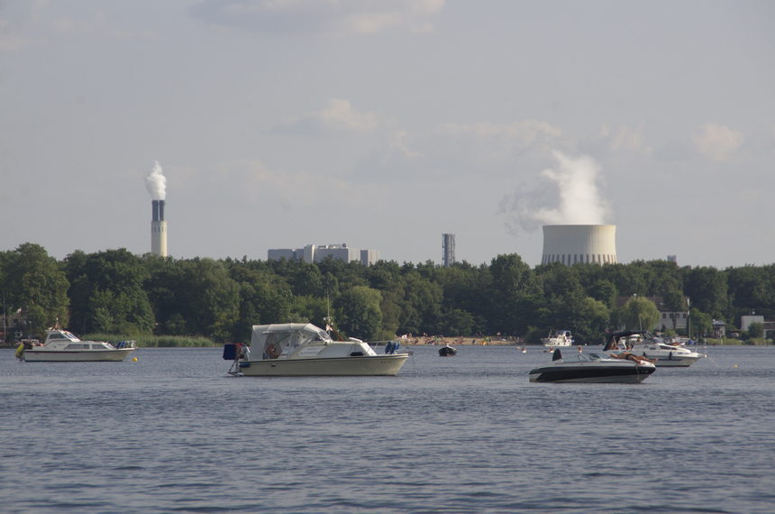 18. 7. 2013. Berlin. Tegel. Tegeler See. Ankernde Motorboote. Hinten Kraftwerk Reuter