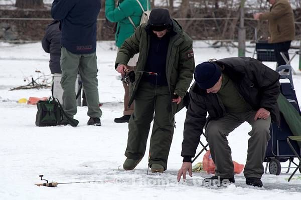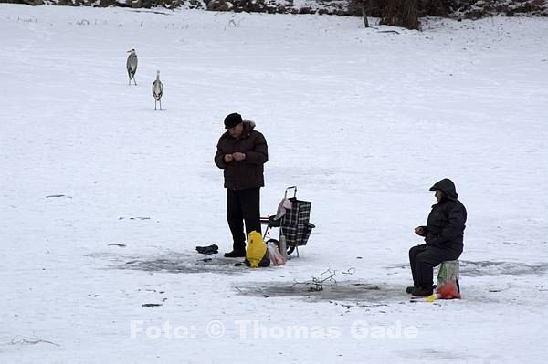 14. 2. 2012. Berlin. Zehlendorf. Wannsee. Zugefrorener Kleiner Wannsee. Winter. Eis. Schnee. Eisangler. Fische