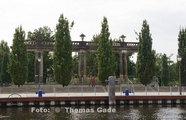 23. 8. 2011. Brandenburg. Potsdam. Havel. Anlegestelle. Weisse Flotte Potsdam. Hinten: Säulen des Neptunbecken im Lustgarten