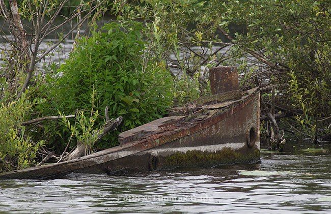 2012. Brandenburg. Havel-Oder-Wasserstraße am Nieder-Neuendorfer See. Künstliche Inseln aus versenkten Binnnenschiffs. Zwischem dem Grün sind Teile der auf Grund liegenden Lastkähne erkennbar.