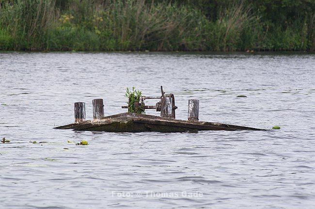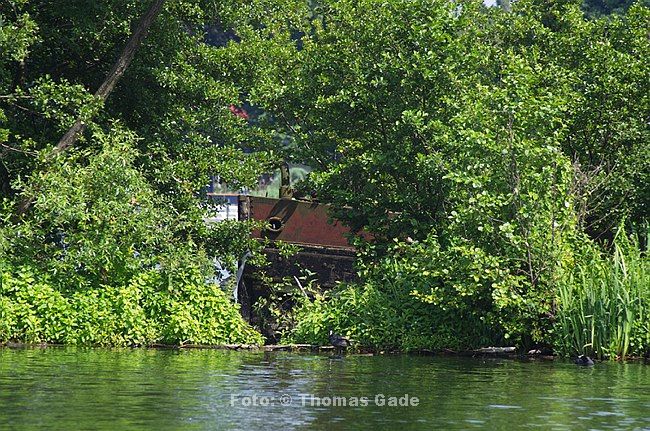 Zur Zeit der Teilung Deutschlands trafen hier Ost und West aufeinander. Der 'eiserne Vorhang' verlief durch das Gewässer. Zur Schaffung eines Kontrollpunktes für die Binnenschifffahrt versenkte die DDR mehrere Lastkähne hintereinander. Sie wurden mit Erde und Schutt aufgefüllt. Heute sind sie baumbewachsene Inseln, auf denen Graureiher / Fischreiher brüten und sich Kormorane aufhalten. Die Lücken zwischen den künstlichen Inseln sind unzulänglich gekennzeichnete Untiefen, die nur an einigen aus dem Wasser aufragenden Aufbauten der versenkten Binnenschiffe erkennbar sind. Revierunkundige Reisende in Booten können in diesem Bereich unerwartet auf die Unterwasserhindernissen auflaufen.