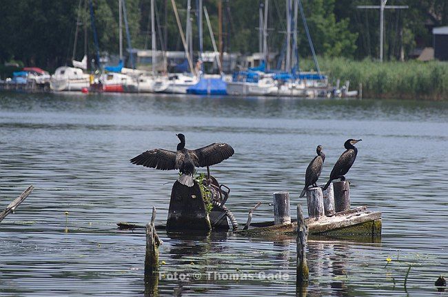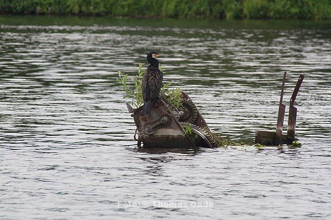 2012. Brandenburg. Havel-Oder-Wasserstraße am Nieder-Neuendorfer See. Vogel. Vögel. Fauna. Tiere. Kormorane nutzen die aus dem Wasser ragenden Teile der versenkten Binnnenschiffe als Rastplatz. Wasservogel