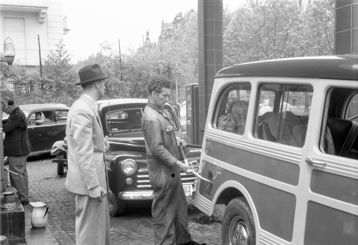 1950. Deutschland. Jeep Station Waggon. Tankwart. Tankstelle