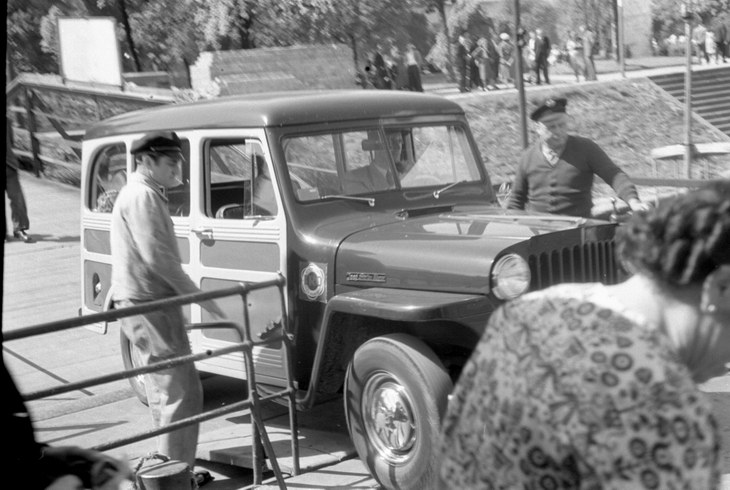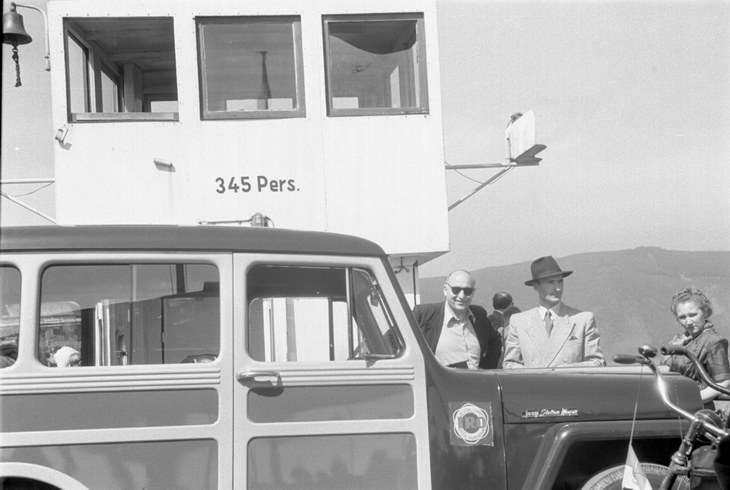 1950. Deutschland. Jeep Station Waggon auf einer Fähre.