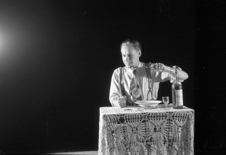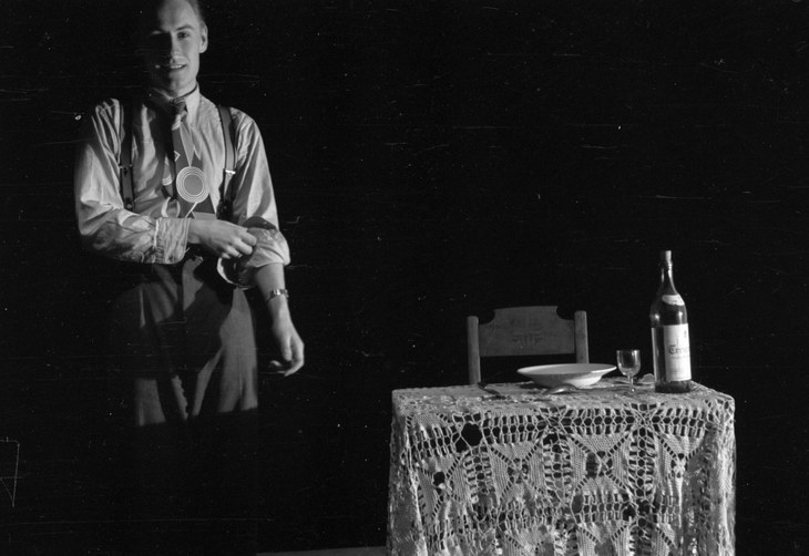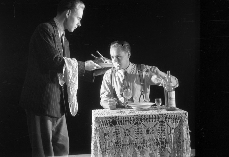 Auf der Bühne. Der gleiche Schauspieler ist durch eine Doppelbelichtung zweimal zu sehen. Das Bild ist nicht ganz gelungen, weil der Teller mit dem Hähnchen und die untere Hand des stehenden Mannes teilweise wie ein Geisterbild über dem Gesicht des sitzenden Mannes liegen.