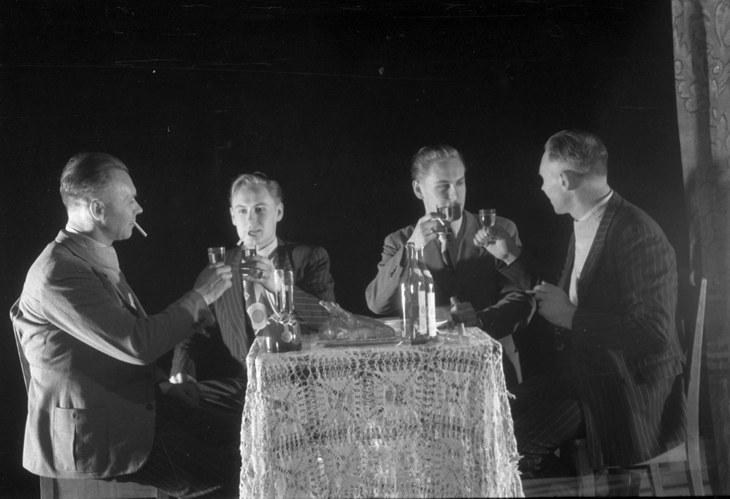 1950. Baden-Württemberg. Theater. Schauspieler auf der Bühne. Eine weitere Doppelbelichtung. Zweimal sind die gleichen Männer beim Zuprosten mit alkoholischen Getränken am Tisch zu sehen.
