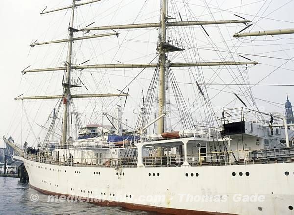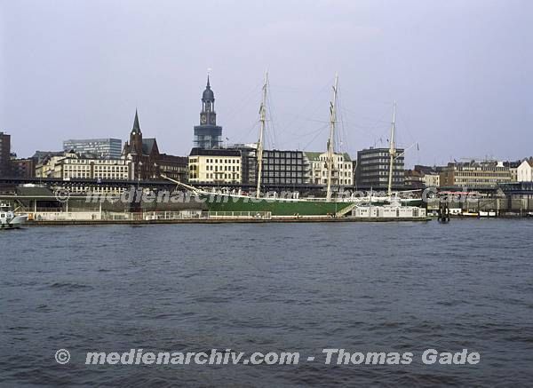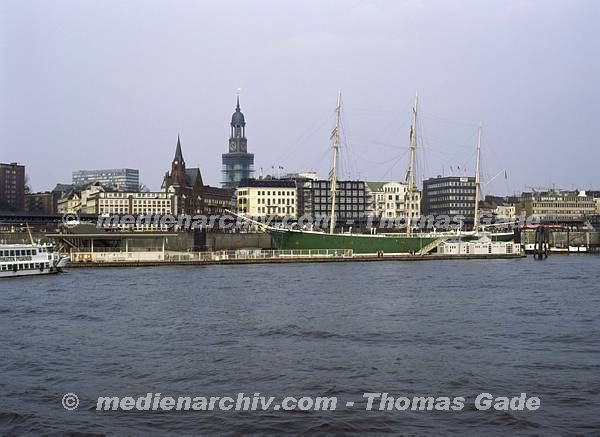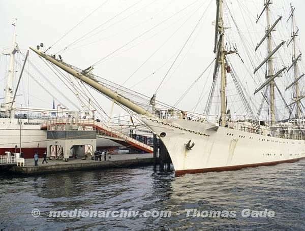 April 1992. Deutschland. Freie und Hansestadt Hamburg. Hafen. Elbe. Schifffahrt / Schiffahrt. Seefahrt. Güterverkehr. Seetransport. Pier. Kaianlagen. Dreimaster. Segelschiff. Windjammer