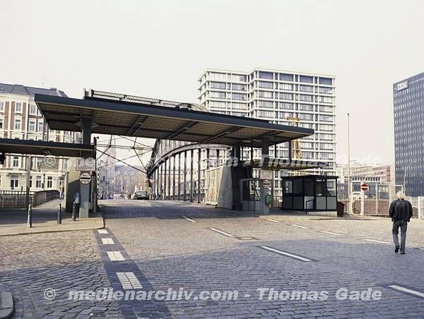 April 1992. Deutschland. Freie und Hansestadt Hamburg. Hafen. Elbe. Schifffahrt / Schiffahrt. Seefahrt. Güterverkehr. Seetransport. Pier. Kaianlagen. Ehemalige Zollkontrollstelle.
