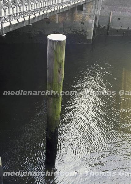 April 1992. Deutschland. Freie und Hansestadt Hamburg. Hafen. Pfahl in einem Fleet in der Speicherstadt.