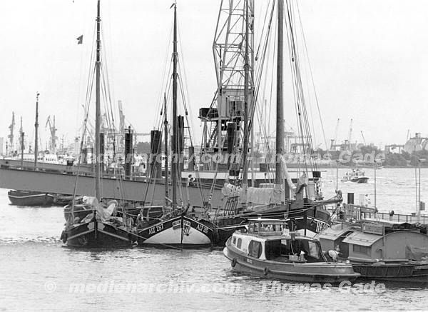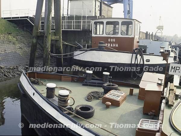 April 1992. Deutschland. Freie und Hansestadt Hamburg. Hafen. Elbe. Schifffahrt / Schiffahrt. Seefahrt. Güterverkehr. Seetransport. Pier. Kaianlagen. Lastkahn. Lastkähne. Schuten.