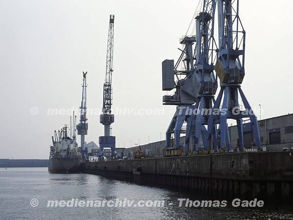 August 1989. Hamburg. Hamburger Hafen. Kran. Schiffe am KAi.