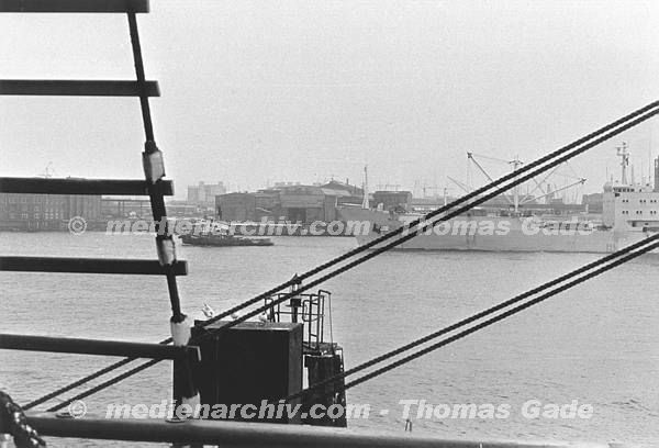 Januar 1988. Hamburg. Hamburger Hafen. Ein Frachter läuft mit Schlepperhilfe ein