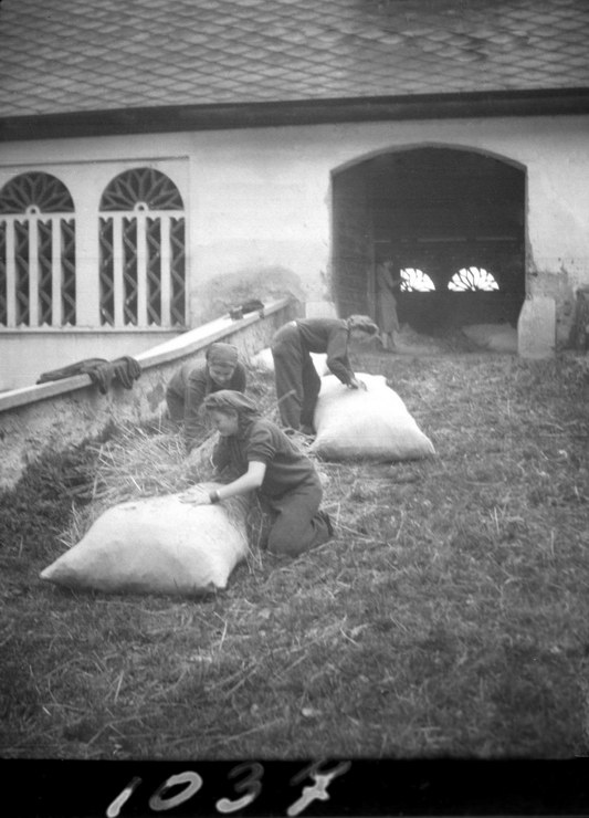 1941. Taferner. Kartoffelernte bei Taferner. Strohsackstopfen