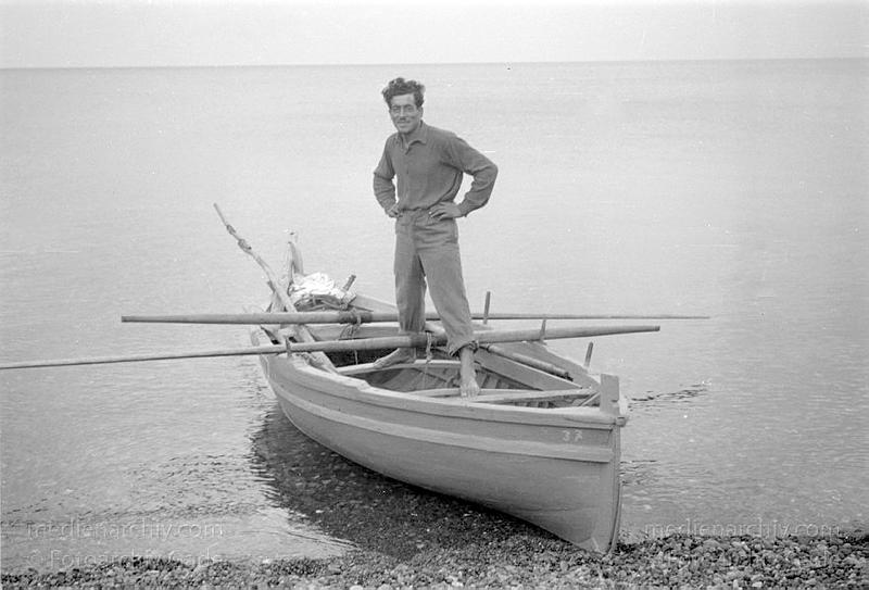 1950. Italien. Sizilien. Provinz Messina. Insel Insel Lipari. Mann in einem Fischerboot. Mittelmeer