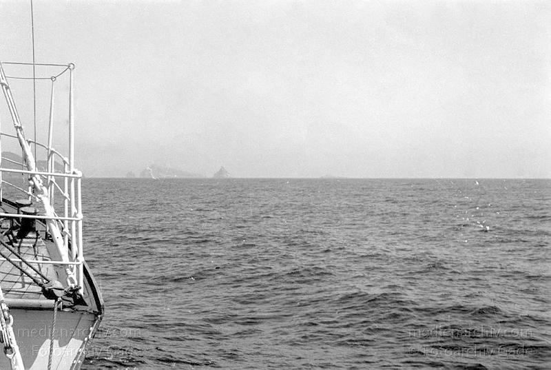 1950er. Italien. Liparische Inseln. Stromboli mit aktivem Vulkan. Italy. Aeolian Islands. Italia. Isola di Stromboli. Schiff