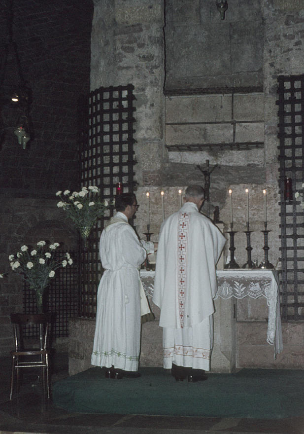 1975. Italien. Italy. Italia. Umbrien. Provinz Perugia. Assisi. Grab der heiligen Franz in der Krypta. Gottesdienst - Italy. Umbria region. Province of Perugia. Assisi.