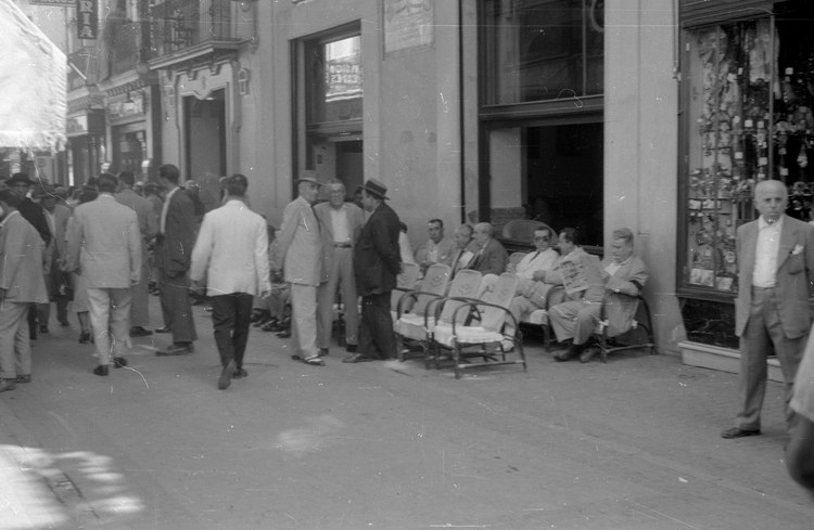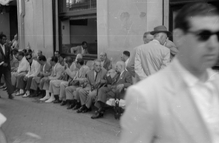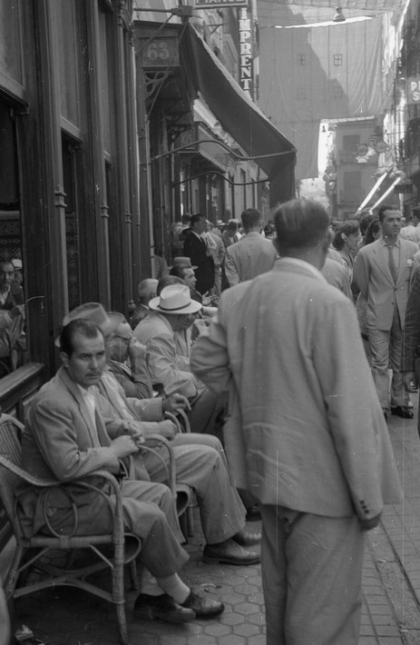 um 1955. Spanien. Spain. Andalusien. Sevilla. Männer auf Stühlen vor einer Bar