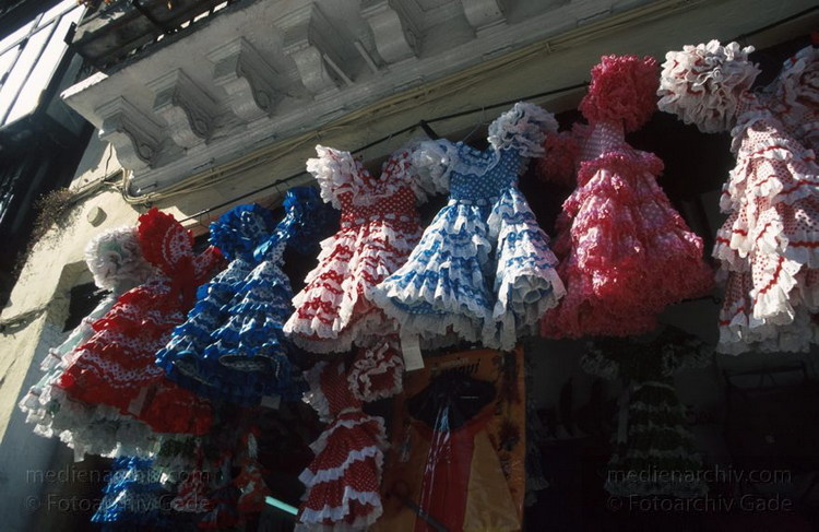 1997. Spanien. Andalusien. Sevilla. Laden mit Flamenco Kleidung.