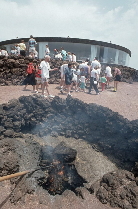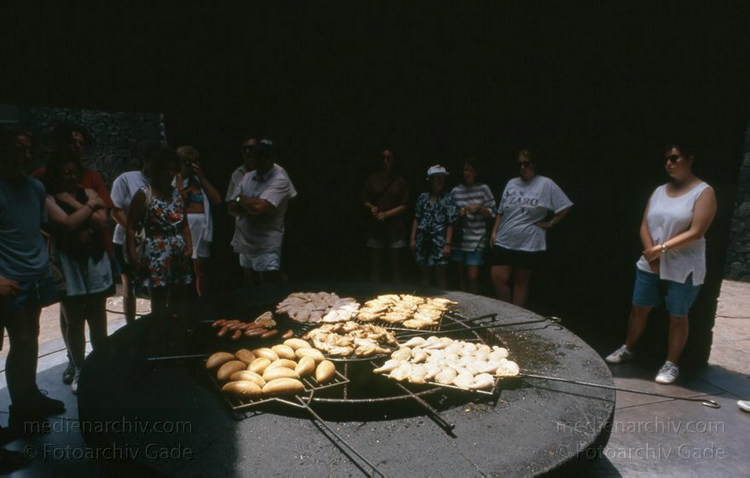 Juli 1994. Lanzarote. Kanarische Inseln. Spanien. Feuerberge - Nationalpark Timanfaya. Vulkane. Lava. Restaurant. Grill über Vulkanhitze. Montañas del Fuego - Parque Nacional de Timanfaya - Spain. Canary Islands. Timanfaya National Park - Espana. Islas Canarias.