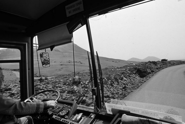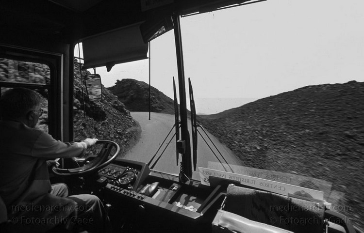 Juli 1994. Lanzarote. Kanarische Inseln. Spanien. Feuerberge - Nationalpark Timanfaya. Vulkane. Lava. Fahrt im Bus. Montañas del Fuego - Parque Nacional de Timanfaya - Spain. CanaryIslands. Timanfaya National Park - Espana. Islas Canarias.