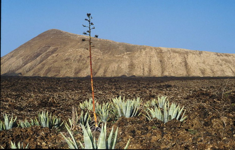 November 1994. Lanzarote. Kanarische Inseln. Spanien. Feuerberge - Nationalpark Timanfaya. Vulkane. Lava. Vegetation. Flora. Pflanzen. Agaven.