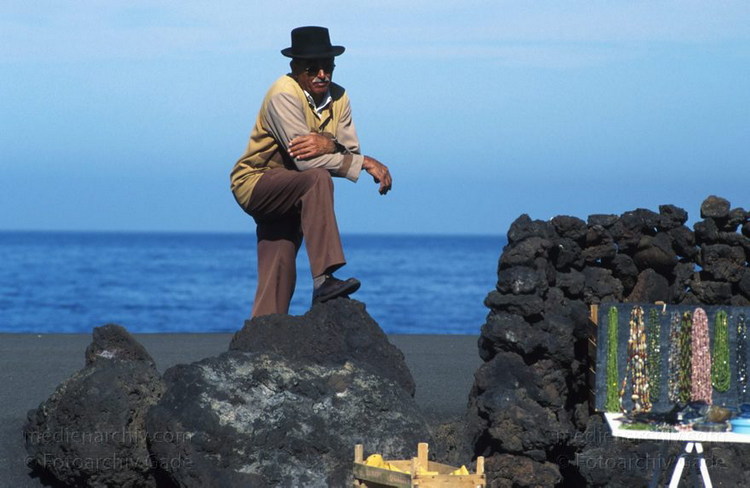 Dezember 1996. Spanien Kanarische Inseln. Lanzarote. Einheimischer Souvernirhändler