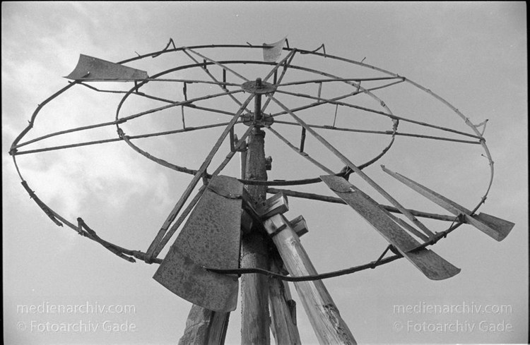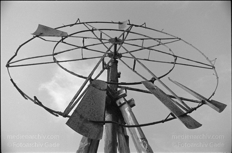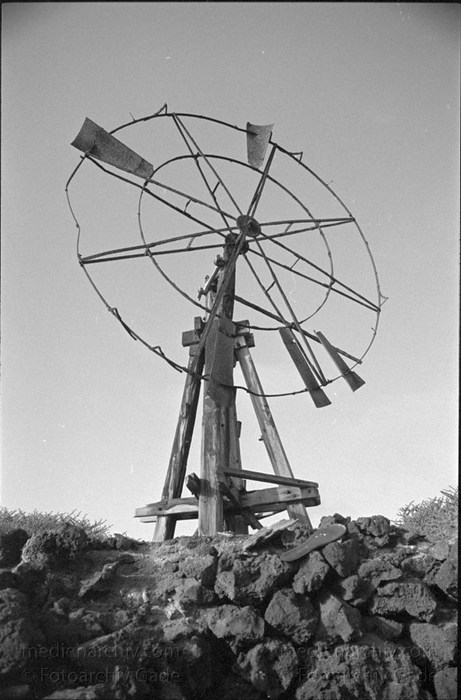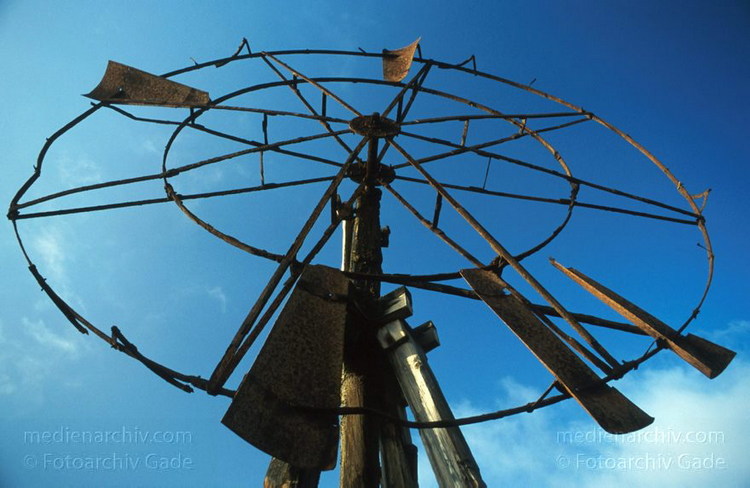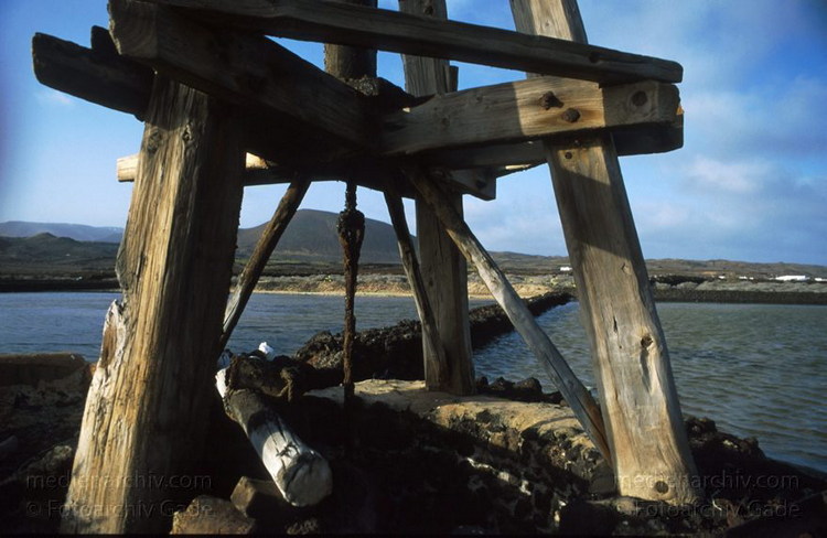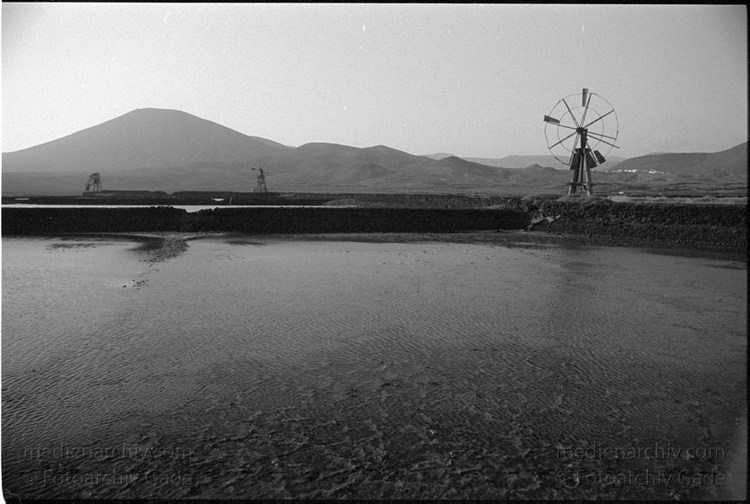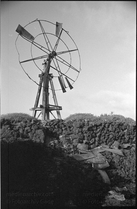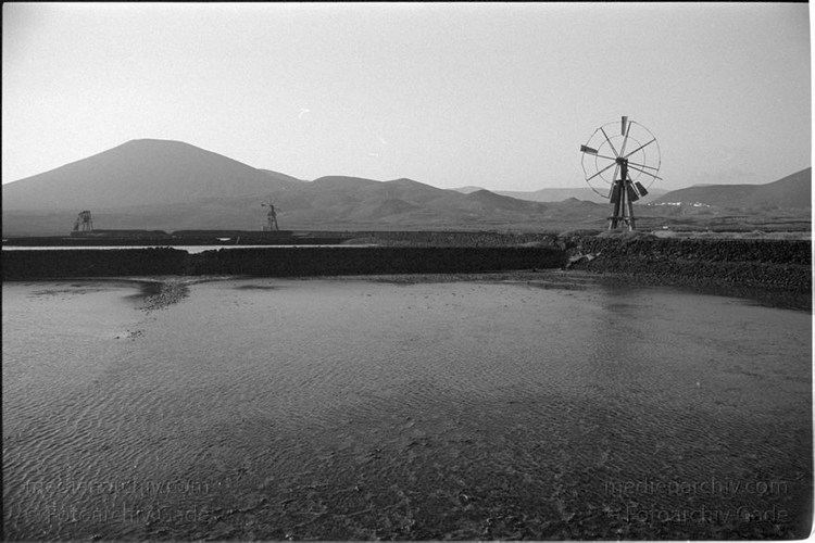 April 1995. Spanien. Kanarische Inseln. Lanzarote. Mühle in einer Saline in Los Cocoteros