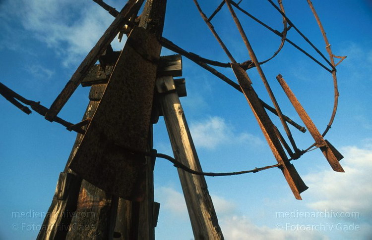 Spanien, Kanarische Inseln, Lanzarote, November 1995. Los Cocoteros. Verwitterte Windmühle zum Antrieb der Wasserpumpen in einer Meersazlgewinnungsanlage.