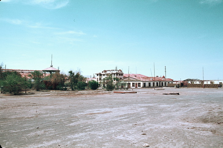 1968. Lateinamerika. Südamerika. Chile. Oficina Chacabuco Nach dem Salpeterkrieg 1878 bis zum 1. Weltkrieg 1914 nahm Chile durch die Salpeterexporte einen enormen wirtschaftlichen Aufschwung. Bald nach Kriegsausbruch schlossen jedoch die meisten Minen, gleichzeitig wurde der künstliche Salpeter erfunden, der Europa, den Hauptabnehmer, unabhängig von den Importen aus Chile machte. Das Land fiel in eine tiefe Wirtschaftskrise. Nach dem Kriege nahmen zwar viele Oficinas den Betrieb wieder auf, der bisherige Boom wiederholte sich aber nicht. Mit neuester Technik und modernsten Maschinen wurde die Oficina Chacabuco im Jahre 1924 eröffnet, aber auch ihr blieb der Erfolg versagt. Blick auf die Plaza mit dem Musikpavillon, dem Theater und der Bibliothek. Zur Zeit des Booms entstanden viele Häfen, um den Salpeter abzutransportieren, Iquique nahm einen gewaltigen Aufschwung, Antofagasta wurde gegründet, wenngleich der viel bessere Hafen Mejillones in einer geschützten Bucht vorhanden war.