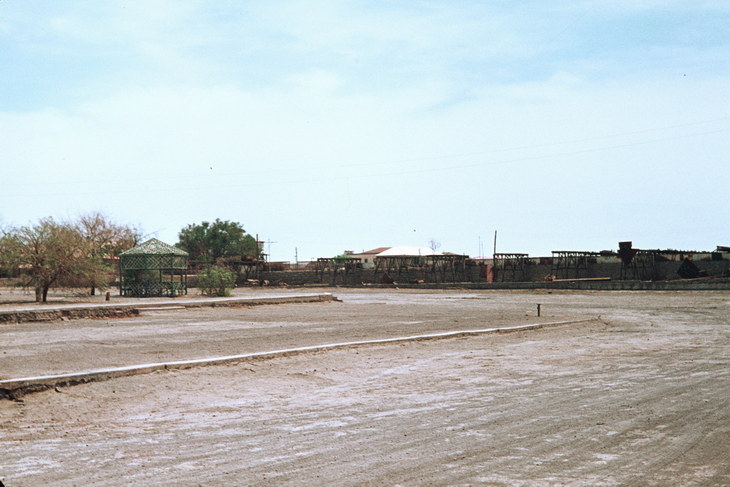 1968. Lateinamerika. Südamerika. Chile. Atacamawüste. Eingang zur Oficina Chacabuco, im Hintergrund der Krankensaal. In ihm standen noch die Bettgestelle mit Nachttöpfen darunter. In der Verwaltung befanden sich Kästen mit den Krankenakten, und das seit über 30 Jahren.