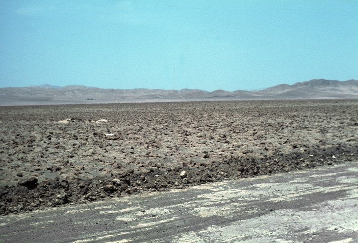 1968. Lateinamerika. Südamerika. Chile. , Atacamawüste. Oficina Chacabuco. Die Salpeterwüste vermittelt mit ihrer vegetationslosen, eintönigen braunen Kruste einen deprimierenden Eindruck. Salpeter liegt nicht offen zutage, die Lager liegen meist dicht unter der harten Erdoberfläche. Das salpeterhaltige Gestein, die Caliche, wird gewonnen, indem man die Wüstenoberfläche durch Sprengungen aufbricht und danach die Caliche fördert.