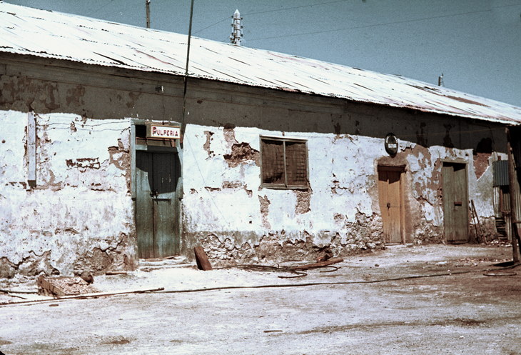 1968. Lateinamerika. Südamerika. Chile. , Atacamawüste. Oficina Chacabuco In der Pulperia, dem Kaufladen der Oficina konnten die Arbeiter die alles einkaufen, was sie zum Leben benötigten. Bezahlt wurde nicht mit Bargeld, sondern mit Fichas, eine Art Firmengeld, das extra gepreßt wurde und nur in der ausgebenden Oficina galt.