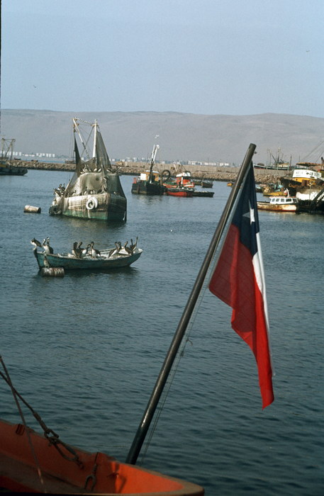 1981. Südamerika. Lateinamerika. Chile. Meer. Hafen. Boote. Pelikane. Chilenische Flagge