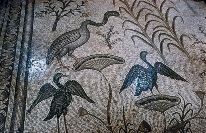 1968. Vorderasien. Nahost. Middle East. Israel. Tiberias. Kirche der Brotvermehrung, Tabhgah Mosaik (5. Jahrhundert) - Lotos mit Kormoranen und Enten