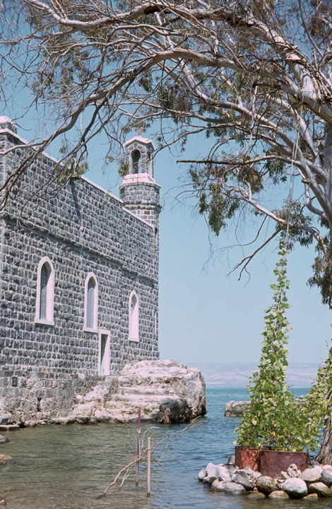 1968. Vorderasien. Nahost. Middle East. Israel. Tiberias. kleine Peterskirche von den Franziskanern auf einer Felsplatte errichtet auf der die Verteilung der Brote und Fische erfolgte, Blick von der Seeseite her